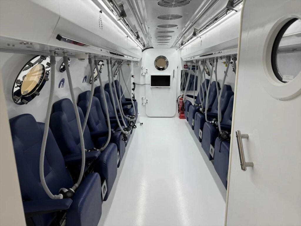 Kameralarla takip edilen, acil durum görüşmeleri sağlayacak telefon bulunan kabinde, 17 metre dalışa eş değer basınca maruz kalan hastalar, seans süresince film izleyip müzik dinleyebiliyor.