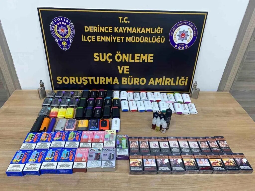 Kocaeli’de kapalı pazarda yapılan kontrollerde gümrük kaçağı 73 elektronik sigara, 19 sigara, elektronik sigara dolumunda kullanılan 8 likit ele geçirildi.